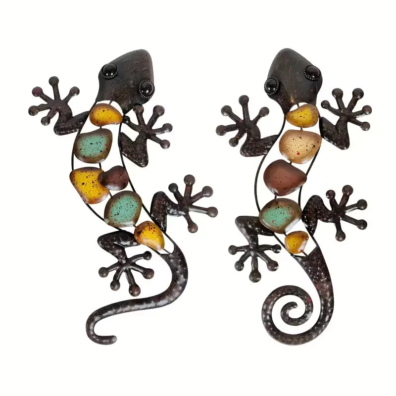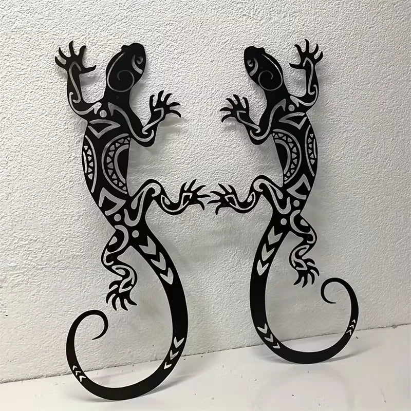 Dekoracja ścienna w kształcie gekona inspirowana motywami natury i sztuką etniczną. Zestaw dwóch figurek w dynamicznych pozach dodaje wnętrzu charakteru i oryginalnego stylu. Świetnie sprawdzi się w salonie, przedpokoju lub na tarasie.