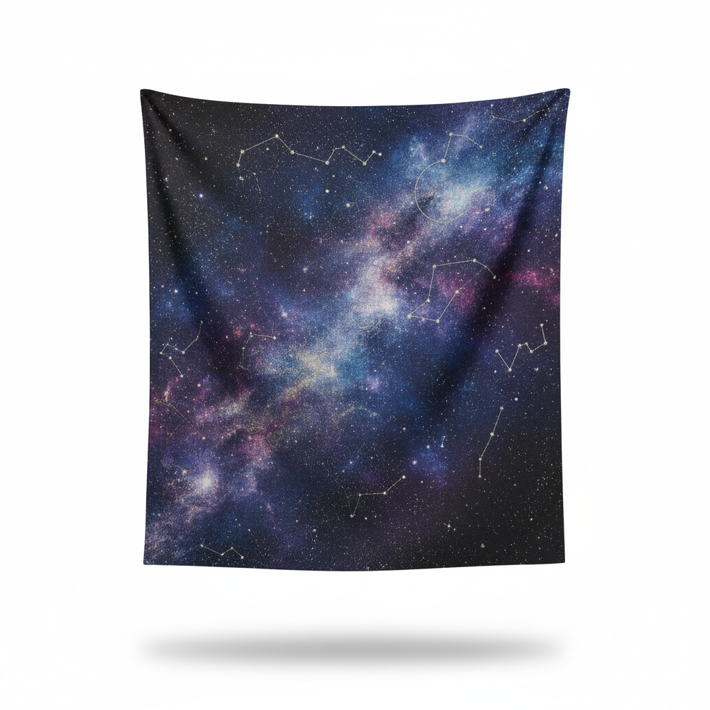 Tapiseria z nocnym niebem wprowadza wyciszony klimat do domowej przestrzeni. Dobrze dopełnia ścianę nad sofą lub łóżkiem.